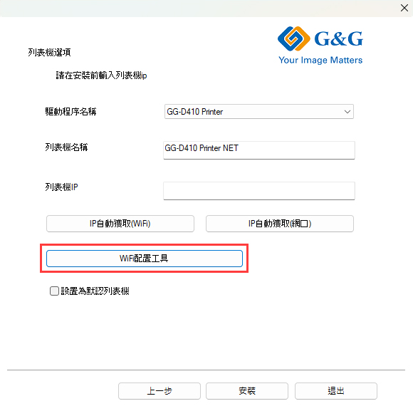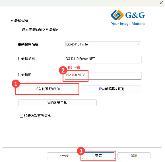 點選IP自動獲取(WiFi)→記下列表機IP(若需要手機平板無線列印)→安裝