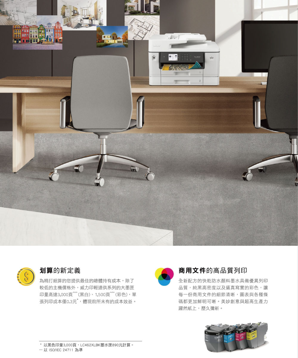 ※ 墨水匣型號:黑 LC462 BK(A4紙張5%覆蓋率 550張)+ 彩 LC462 C / M / Y(A4紙張5%覆蓋率 各 550張)