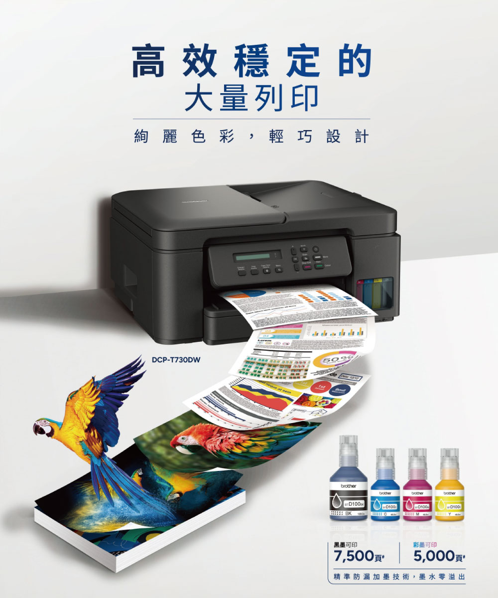 ※ 墨水匣型號:黑 BTD100 BK(A4紙張5%覆蓋率 7500張)+ 彩 BTD100 C / M / Y(A4紙張5%覆蓋率 各 5000張)