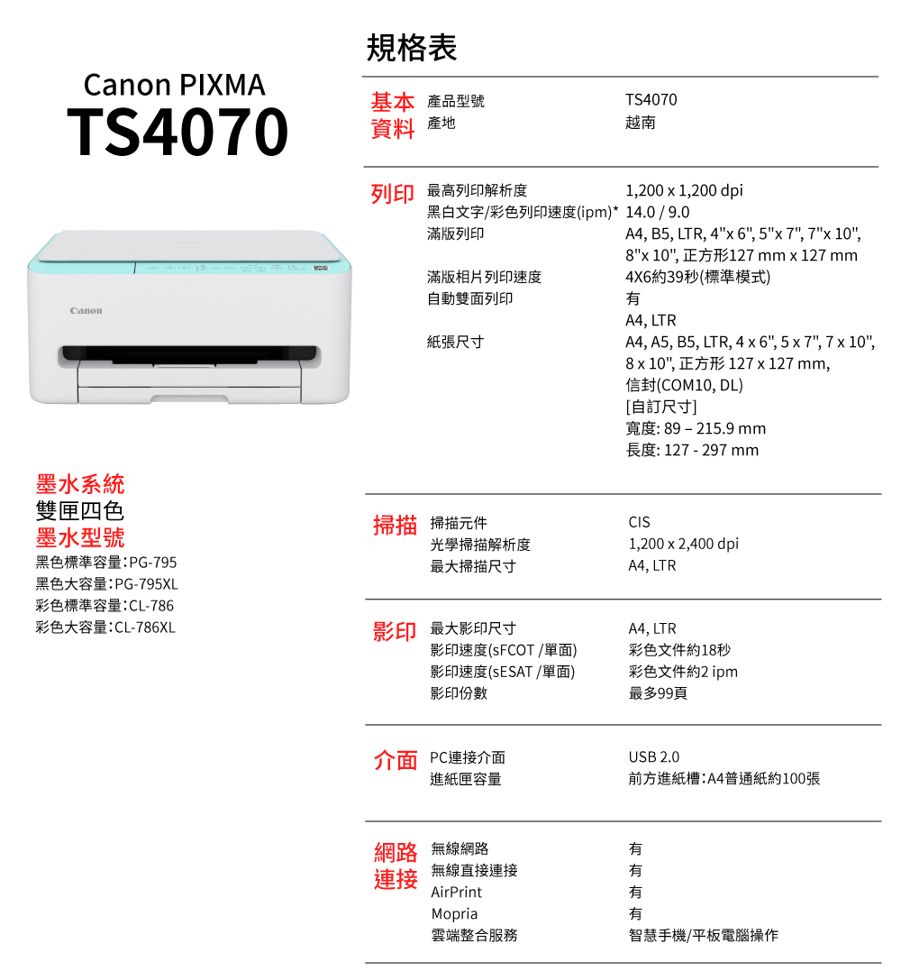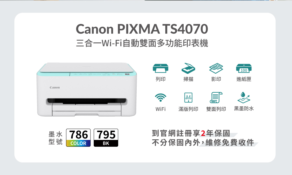 ※ 使用墨水匣型號:PG-795黑色/PG-795XL黑色/CL-786彩色/CL-786XL彩色