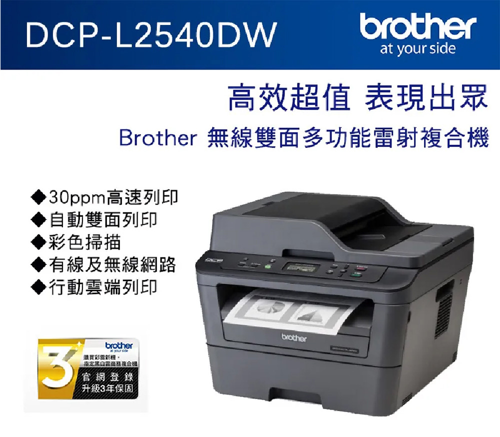 ② L2540DW機器【含A4紙張5%覆蓋率 5200張高印量副廠碳粉/光鼓+發票】(不含原廠隨機耗材)