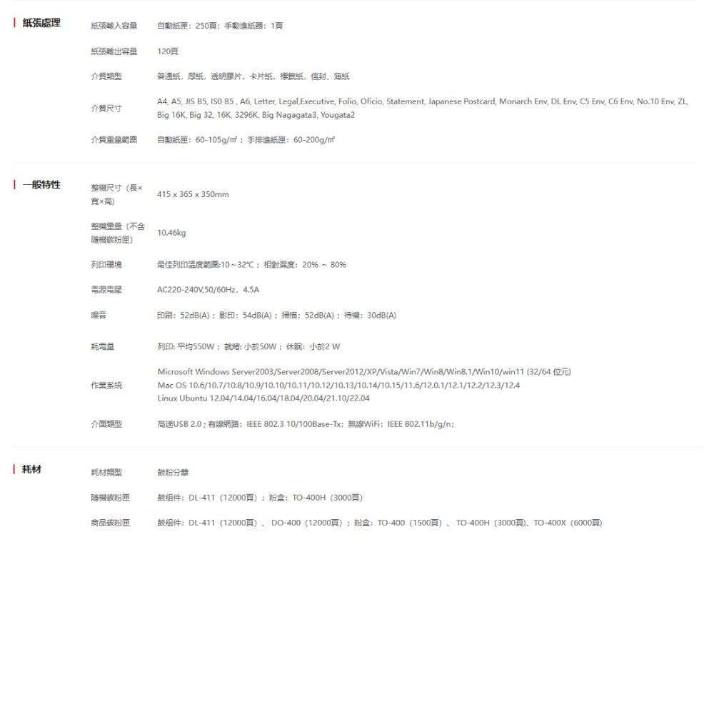 ※ 使用感光鼓型號:DL410(A4紙張5%覆蓋率 12000張)