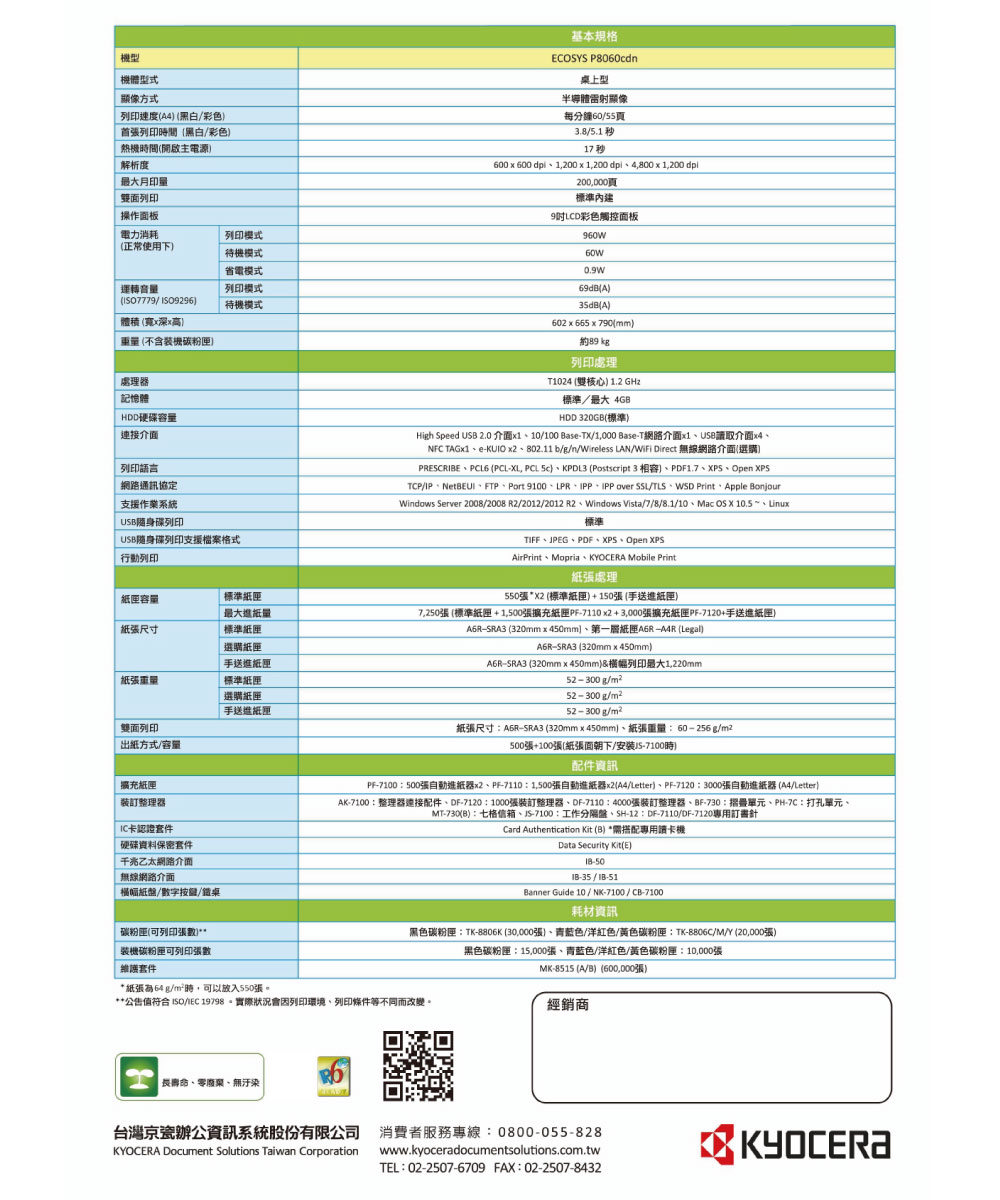 KYOCERA ECOSYS P8060cdn 高速 彩色雷射印表機(無wifi功能)